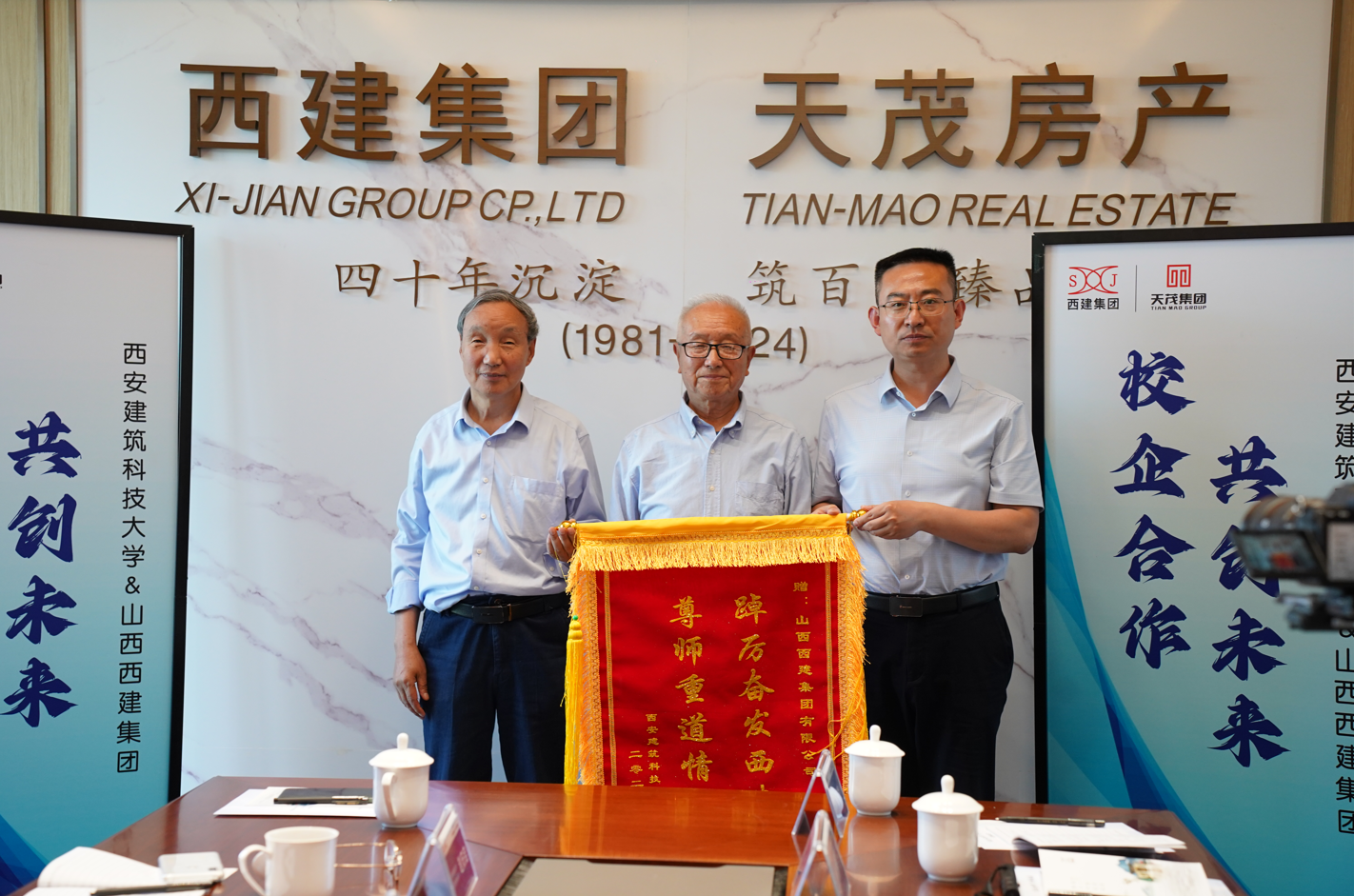 西安建大老教授協(xié)會會長王齊銘、西安建大老教授協(xié)會秘書長趙安啟為西建集團(tuán)送予錦旗